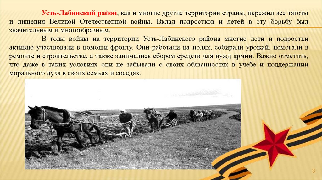 Усть-Лабинский район, как и многие другие территории страны, пережил все тяготыи лишения Великой Отечественной войны. Вклад подростков и детей в эту борьбу был