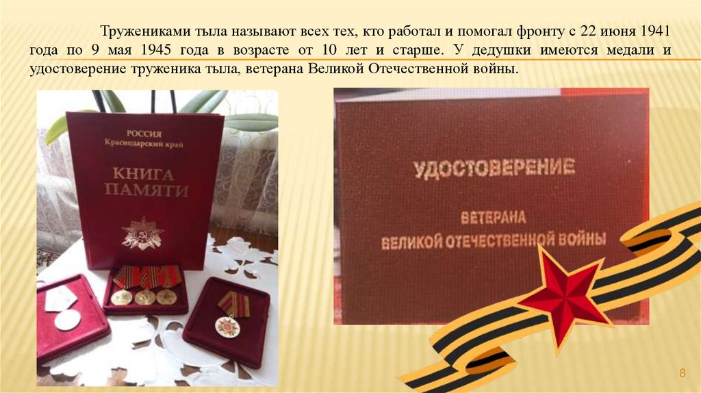 Тружениками тыла называют всех тех, кто работал и помогал фронту с 22 июня 1941года по 9 мая 1945 года в возрасте от 10 лет и старше. У дедушки имеются медали и