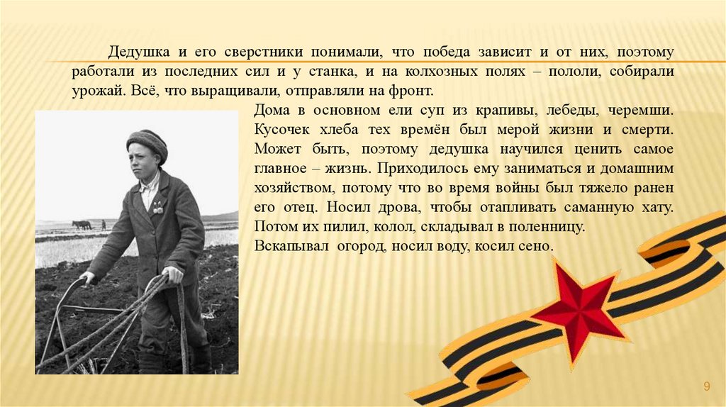Дедушка и его сверстники понимали, что победа зависит и от них, поэтомуработали из последних сил и у станка, и на колхозных полях – пололи, собирали