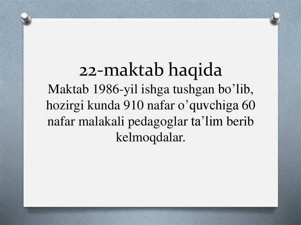 22-maktab haqidaMaktab 1986-yil ishga tushgan bo’lib,