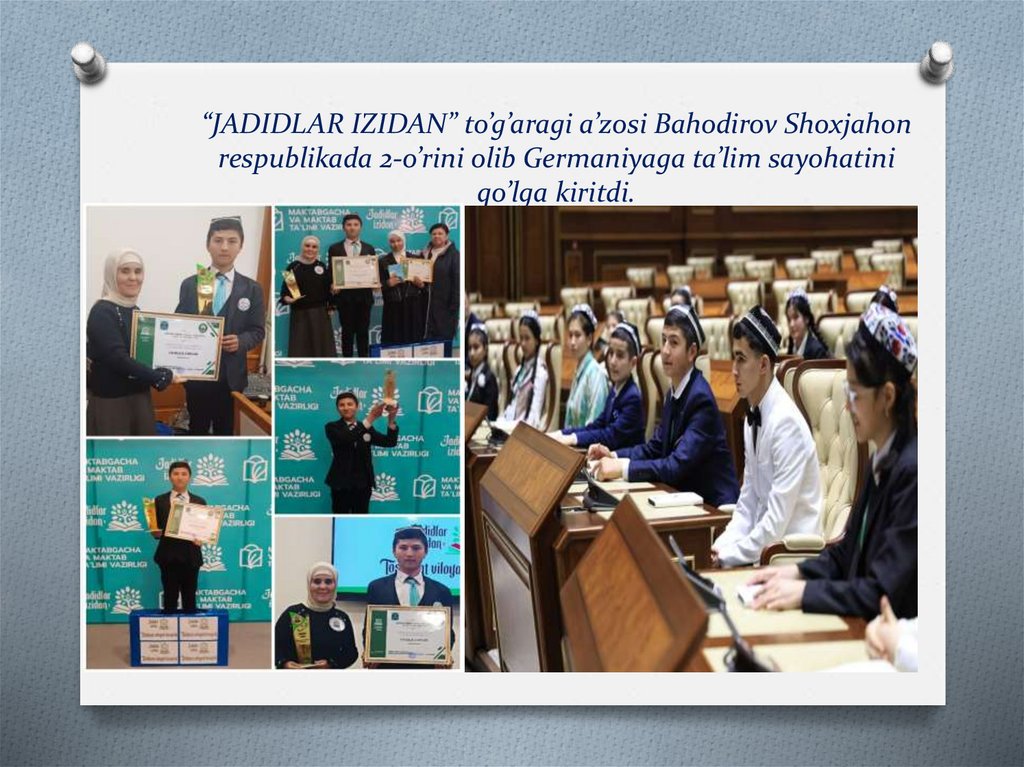“JADIDLAR IZIDAN” to’g’aragi a’zosi Bahodirov Shoxjahonrespublikada 2-o’rini olib Germaniyaga ta’lim sayohatini