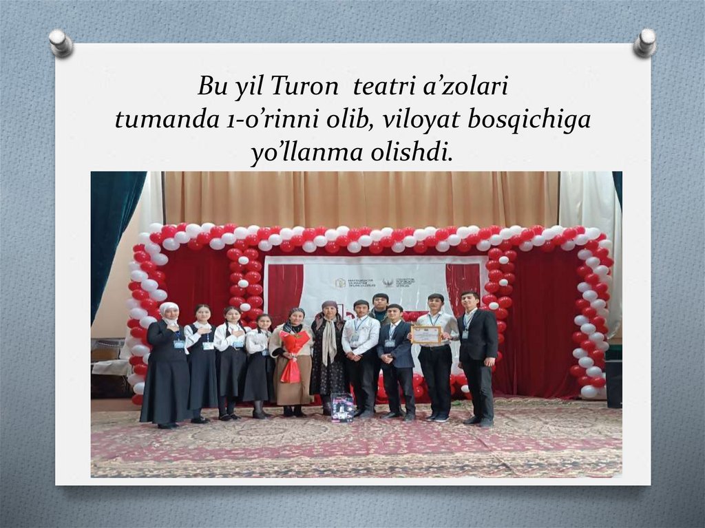 Bu yil Turon teatri a’zolaritumanda 1-o’rinni olib, viloyat bosqichiga
