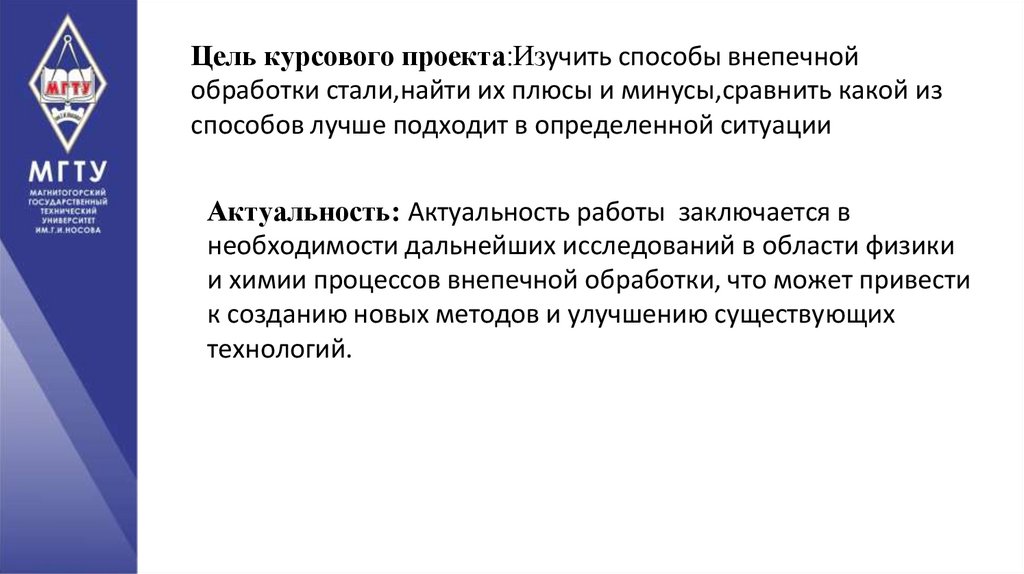 Цель курсового проекта:Изучить способы внепечнойобработки стали,найти их плюсы и минусы,сравнить какой из