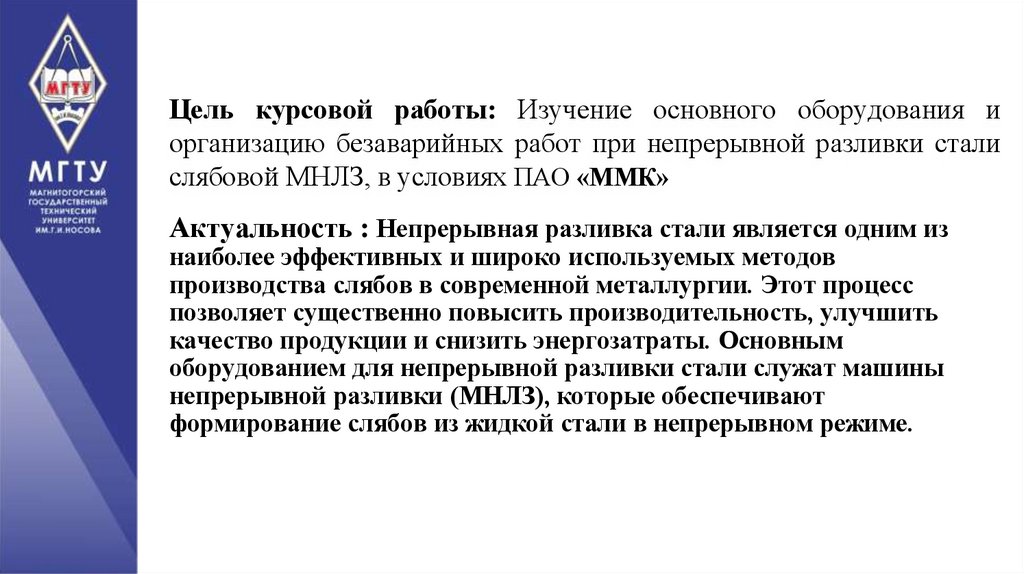 Цель курсовой работы: Изучение основного оборудования иорганизацию безаварийных работ при непрерывной разливки стали