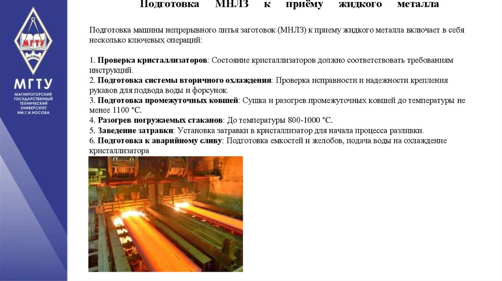 Информация о готовности МНЛЗ к разливкеГотовность машины непрерывного литья заготовок (МНЛЗ) к разливке включает в себя