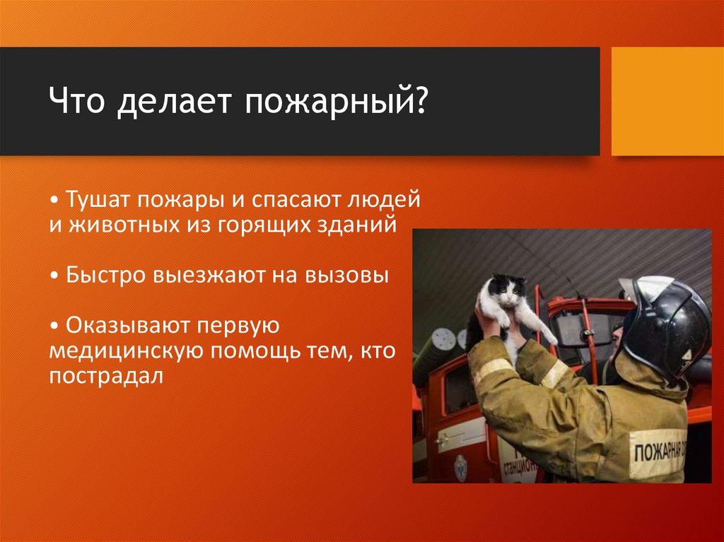 Что делает пожарный?⦁ Тушат пожары и спасают людей