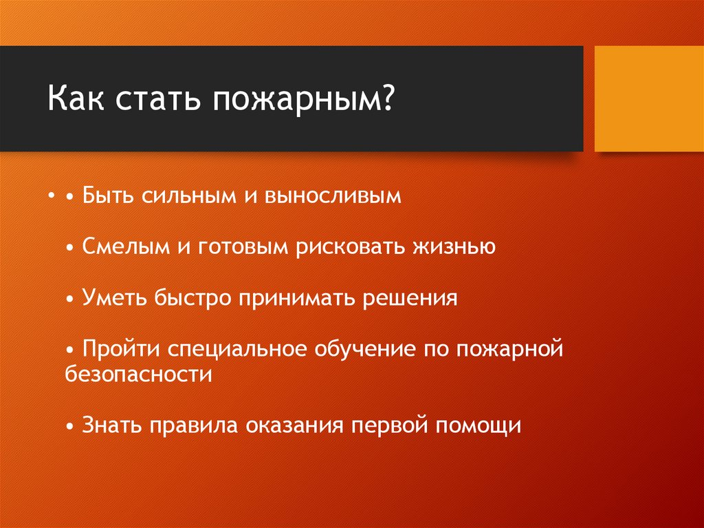 Как стать пожарным?• ⦁ Быть сильным и выносливым