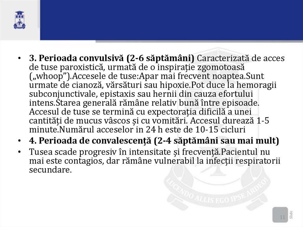 • 3. Perioada convulsivă (2-6 săptămâni) Caracterizată de accesde tuse paroxistică, urmată de o inspirație zgomotoasă