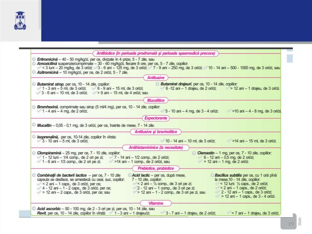 Antibiotic: Azitromicină (pentru tratamentul infecției cu Bordetella pertussis).Eritromicina,