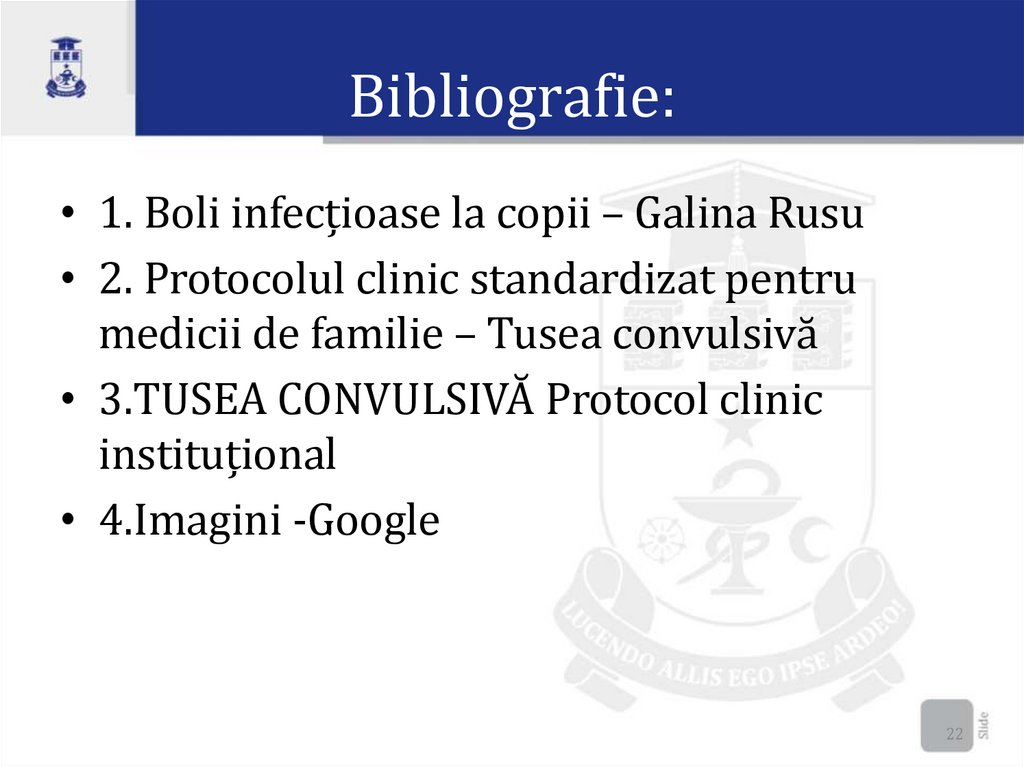 Bibliografie:• 1. Boli infecțioase la copii – Galina Rusu