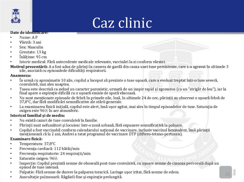 Motivul prezentării: A a fost adus de părinți la camera de gardă din cauza unei tuse persistente, care s-a agravat în ultimele 3