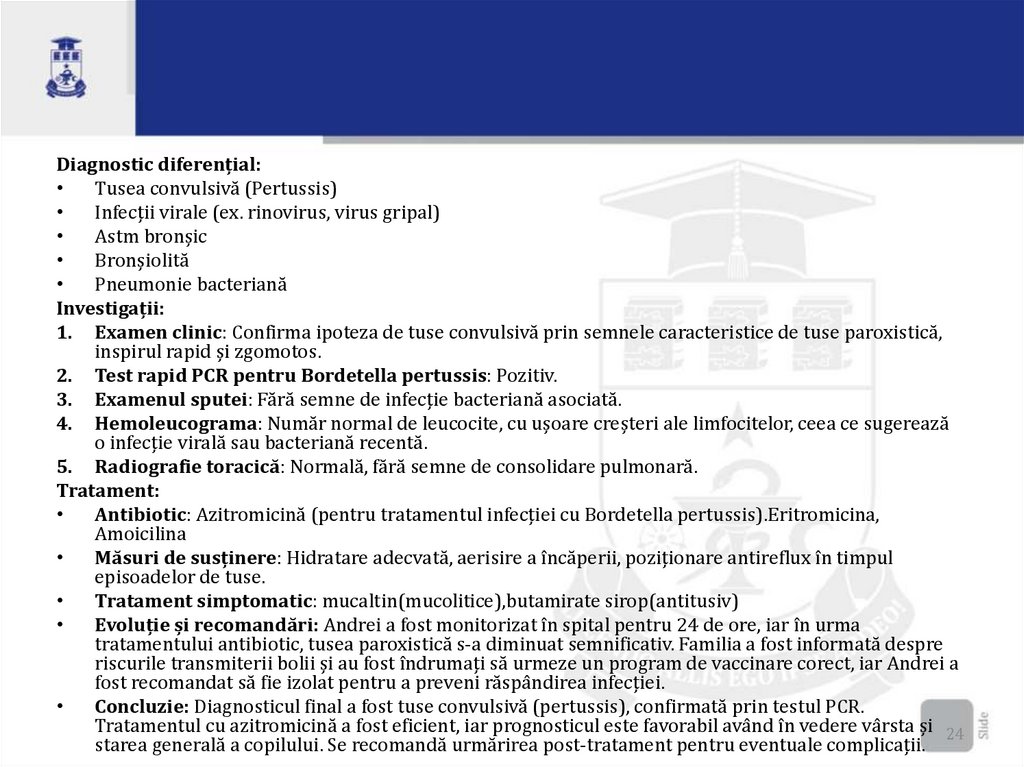 Concluzie: Diagnosticul final a fost tuse convulsivă (pertussis), confirmată prin testul PCR.