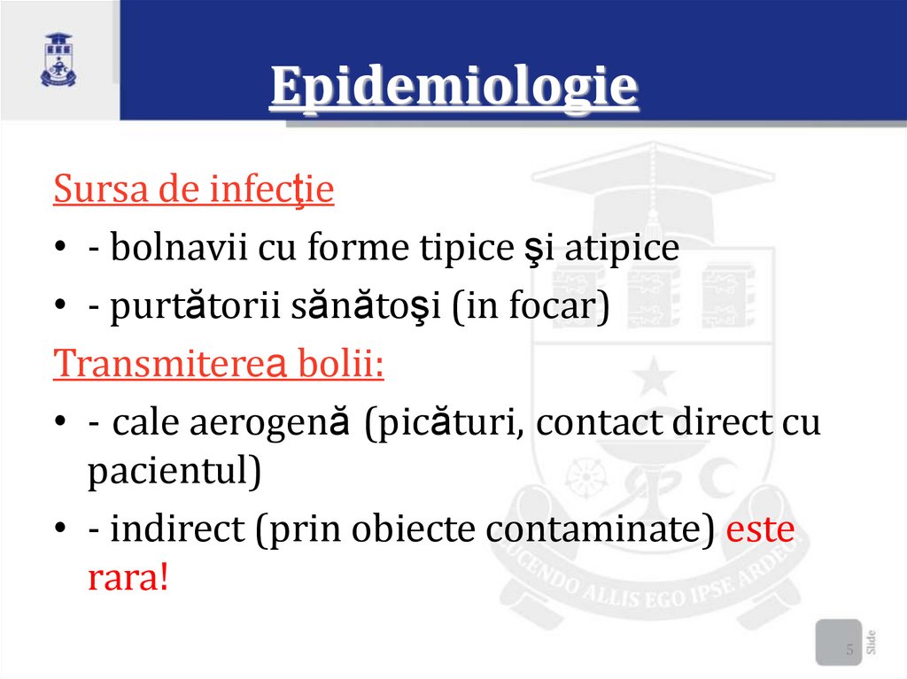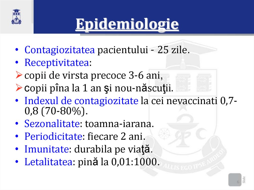Epidemiologie• Contagiozitatea pacientului - 25 zile.
