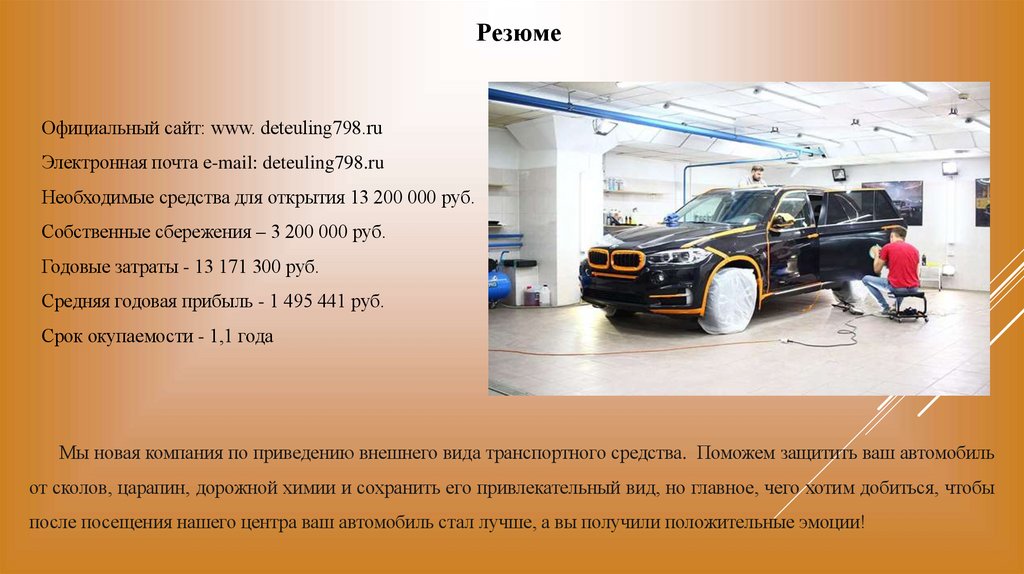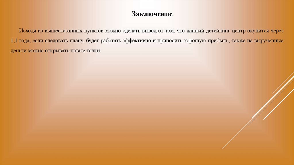 ЗаключениеИсходя из вышесказанных пунктов можно сделать вывод от том, что данный детейлинг центр окупится через