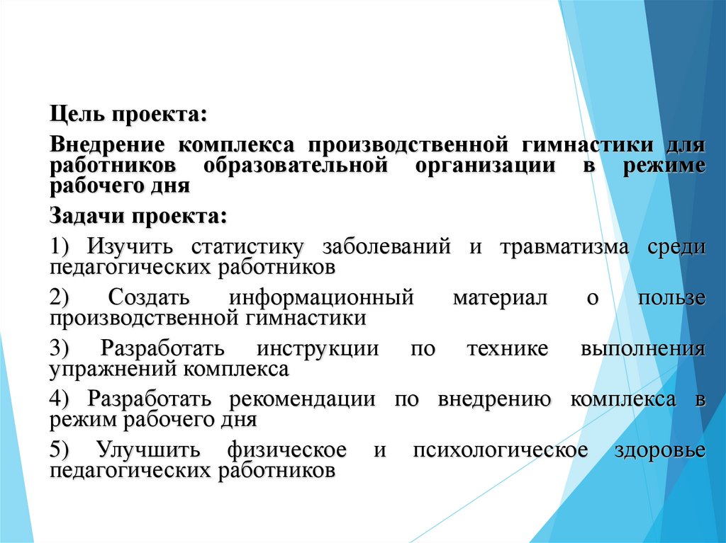 Цель проекта:Внедрение комплекса производственной гимнастики для