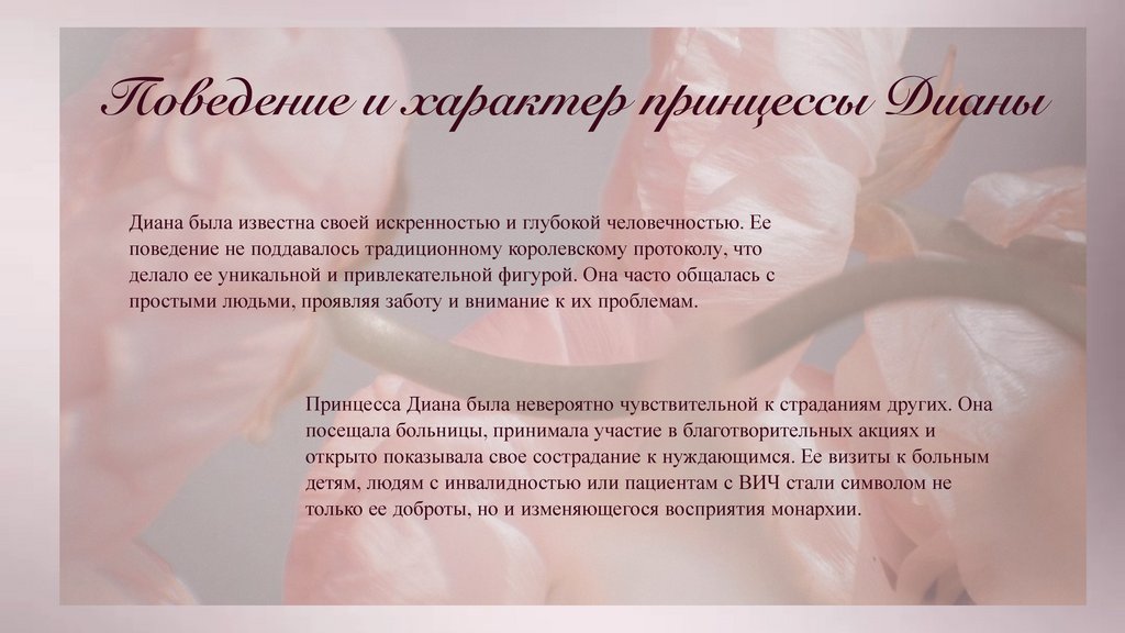 Поведение и характер принцессы ДианыДиана была известна своей искренностью и глубокой человечностью. Ее