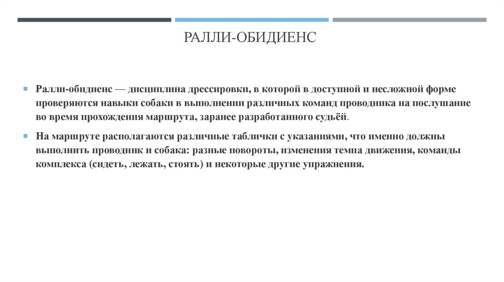 РАЛЛИ-ОБИДИЕНСРалли-обидиенс — дисциплина дрессировки, в которой в доступной и несложной форме