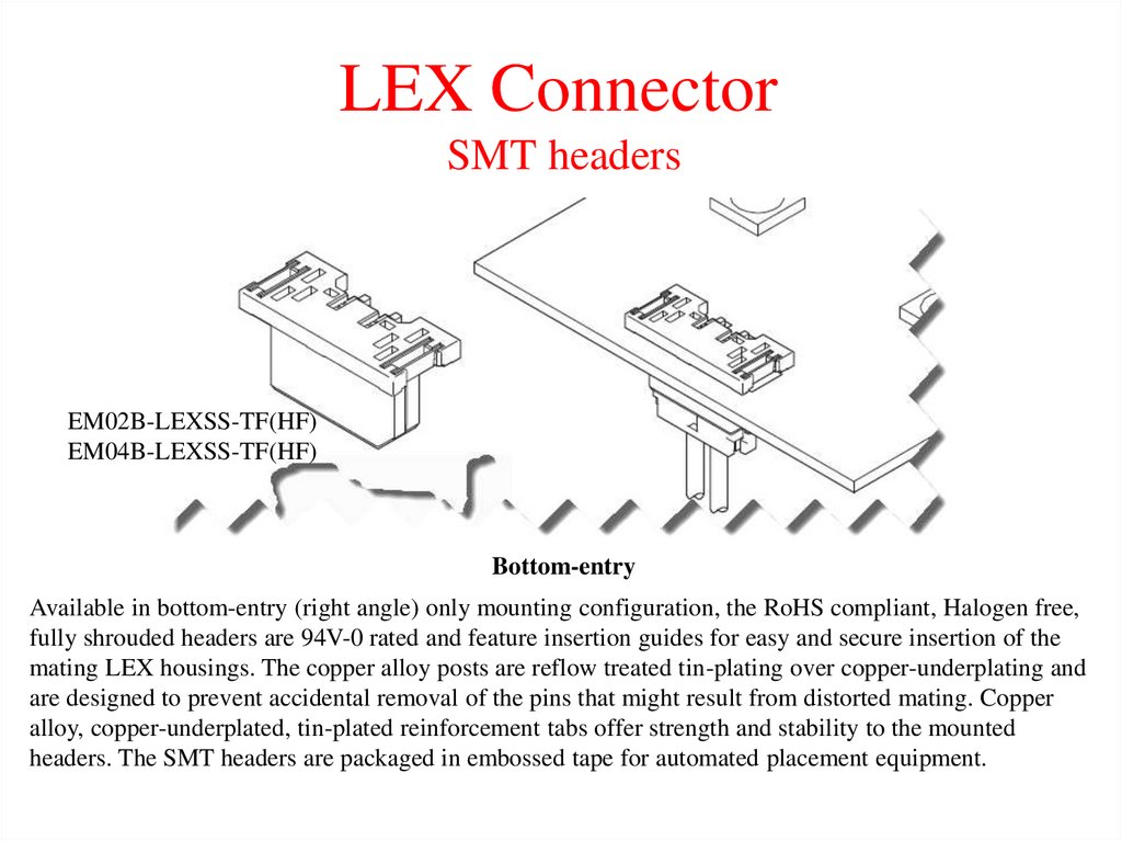 The LEX wire-to-board connector is a low profile, compact connector system:• Compact size and pitch