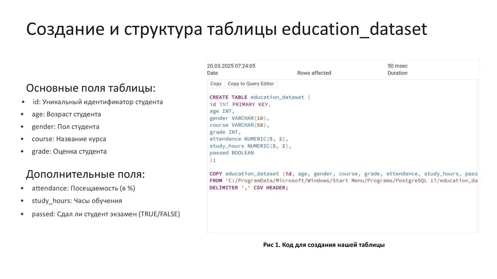 Создание и структура таблицы education_datasetОсновные поля таблицы: