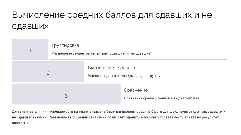 Для анализа влияния успеваемости на сдачу экзамена были вычислены средние баллы для двух групп студентов: сдавших и