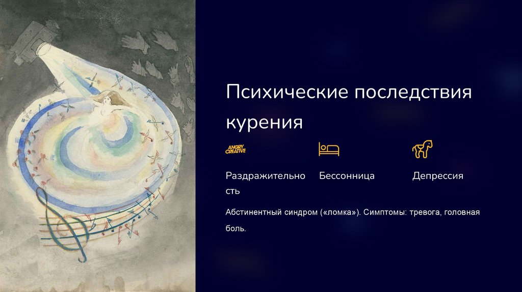 Абстинентный синдром («ломка»). Симптомы: тревога, головная