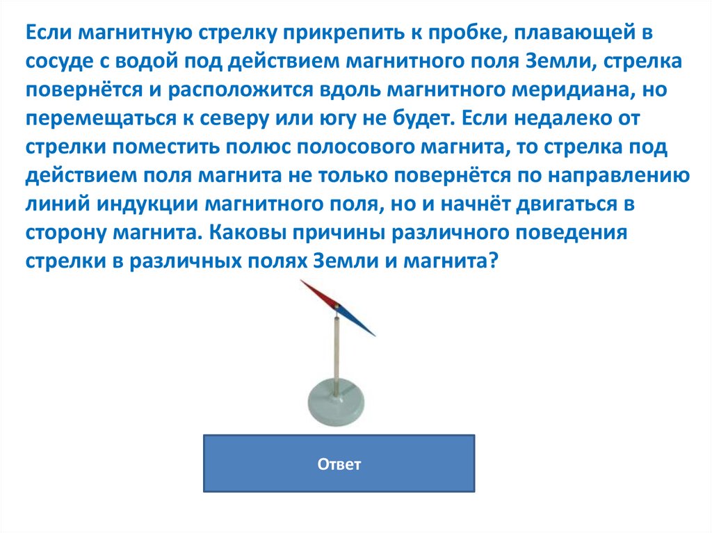 Если магнитную стрелку прикрепить к пробке, плавающей всосуде с водой под действием магнитного поля Земли, стрелка