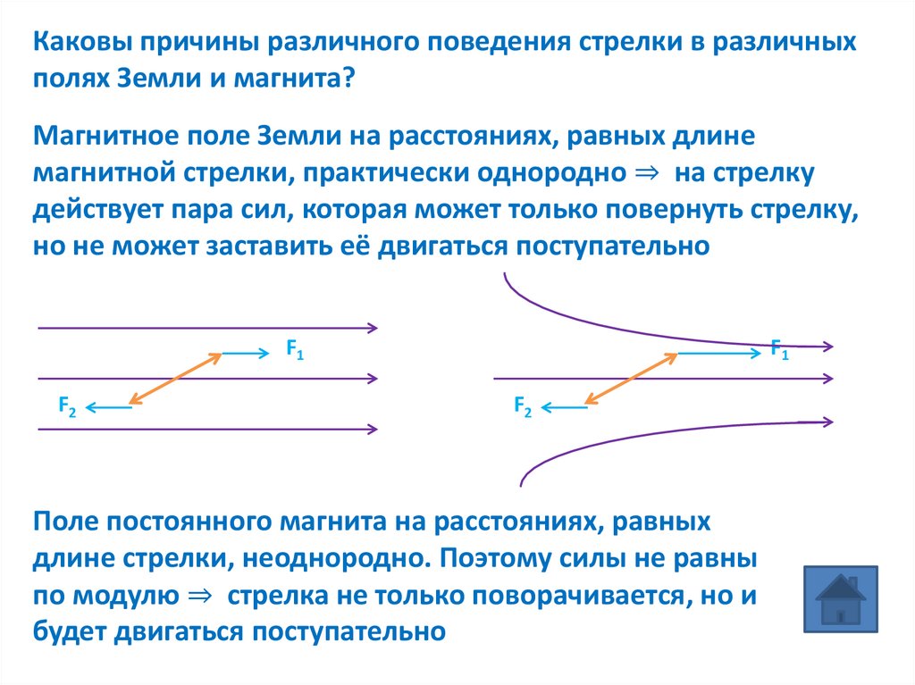 Каковы причины различного поведения стрелки в различныхполях Земли и магнита?
