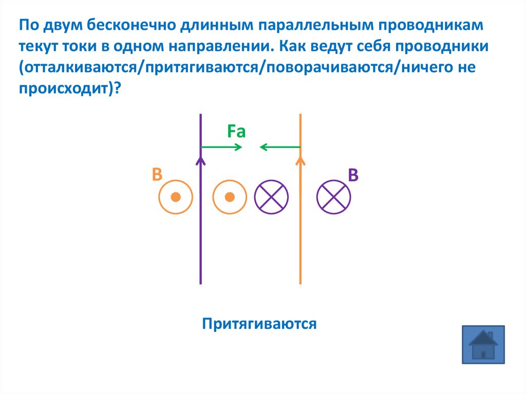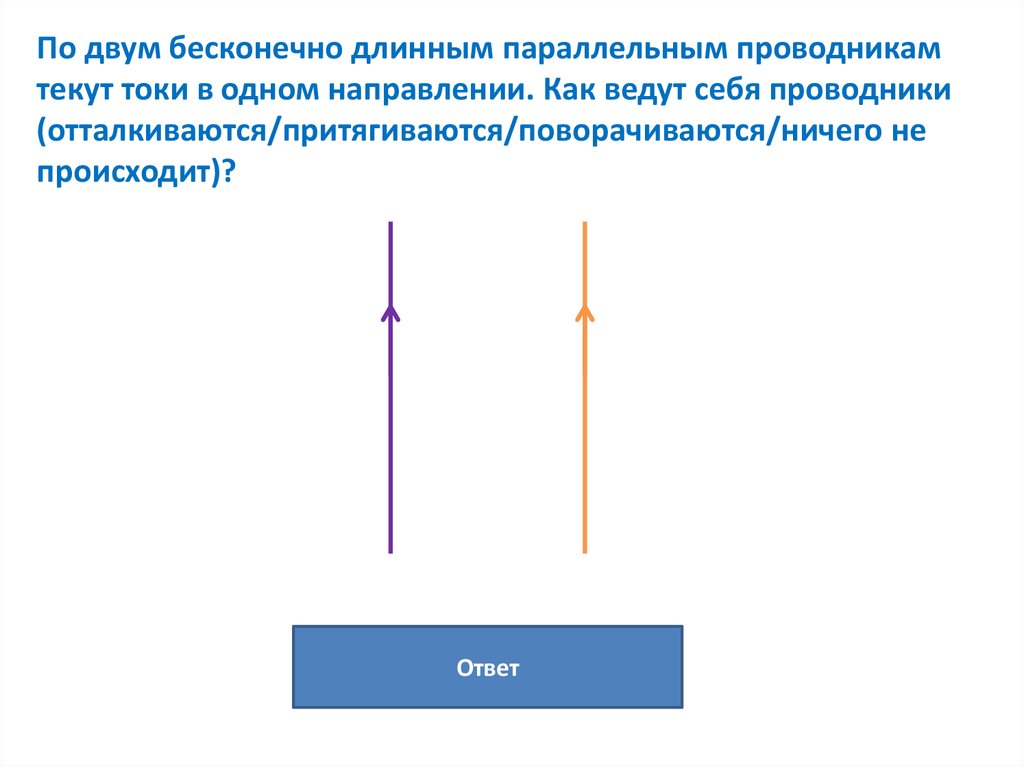 По двум бесконечно длинным параллельным проводникамтекут токи в одном направлении. Как ведут себя проводники