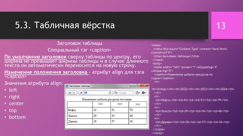 Изменение положения заголовка - атрибут align для тэга cellspacing="0">