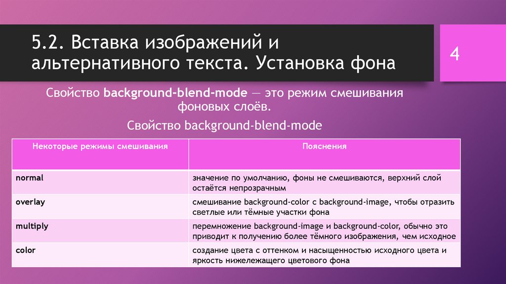 4. 5.2. Вставка изображений и альтернативного текста. Установка фона