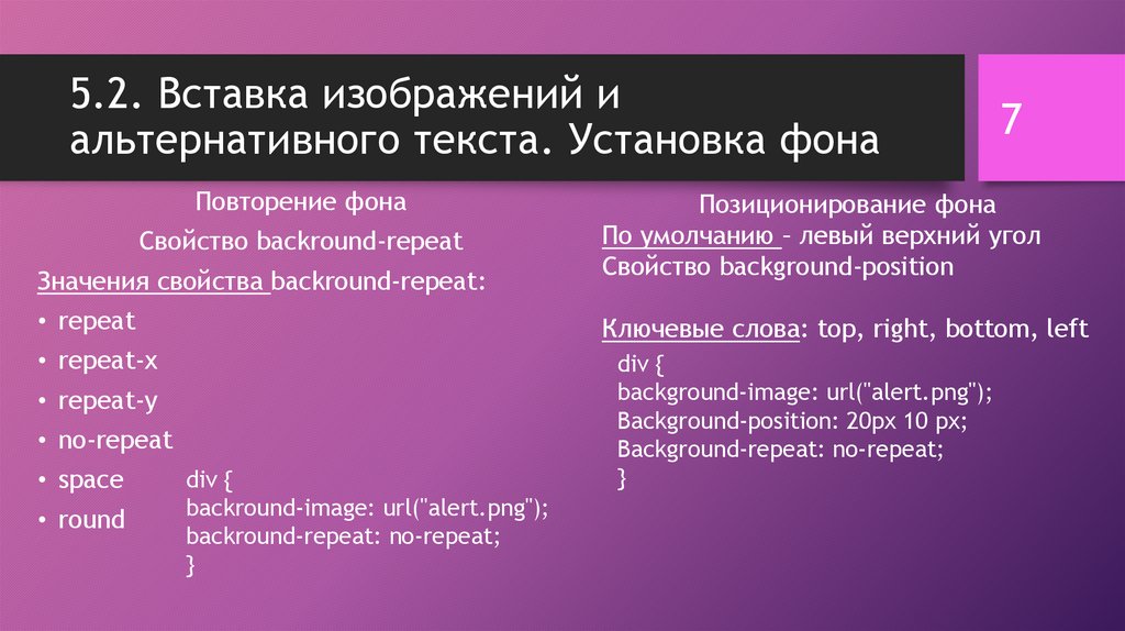 7. 5.2. Вставка изображений и альтернативного текста. Установка фона