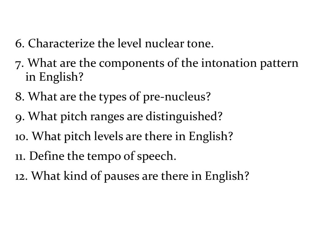 6. Characterize the level nuclear tone.7. What are the components of the intonation pattern