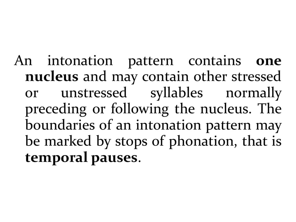 An intonation pattern contains onenucleus and may contain other stressed