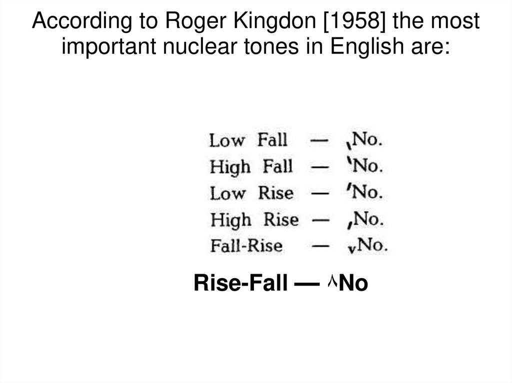 According to Roger Kingdon [1958] the mostimportant nuclear tones in English are: