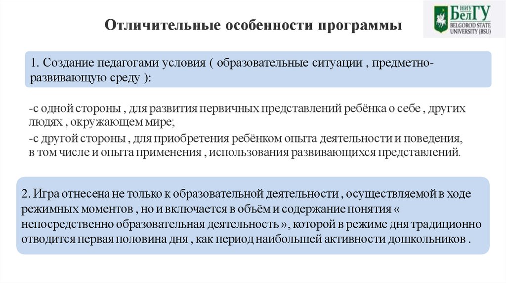 Отличительные особенности программы1. Создание педагогами условия ( образовательные ситуации , предметноразвивающую среду ):