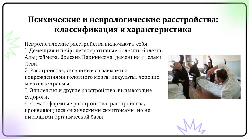Неврологические расстройства включают в себя1. Деменция и нейродегенеративные болезни: болезнь