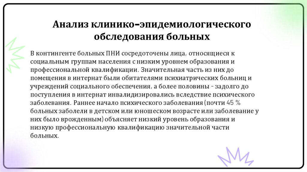 В контингенте больных ПНИ сосредоточены лица, относящиеся ксоциальным группам населения с низким уровнем образования и