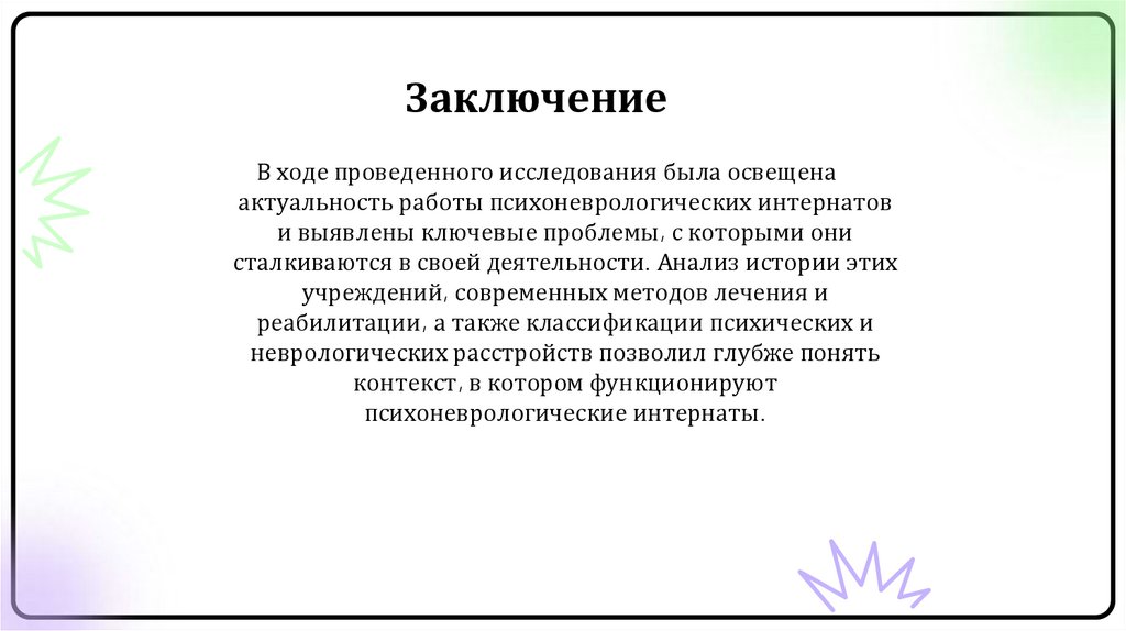 В ходе проведенного исследования была освещенаактуальность работы психоневрологических интернатов