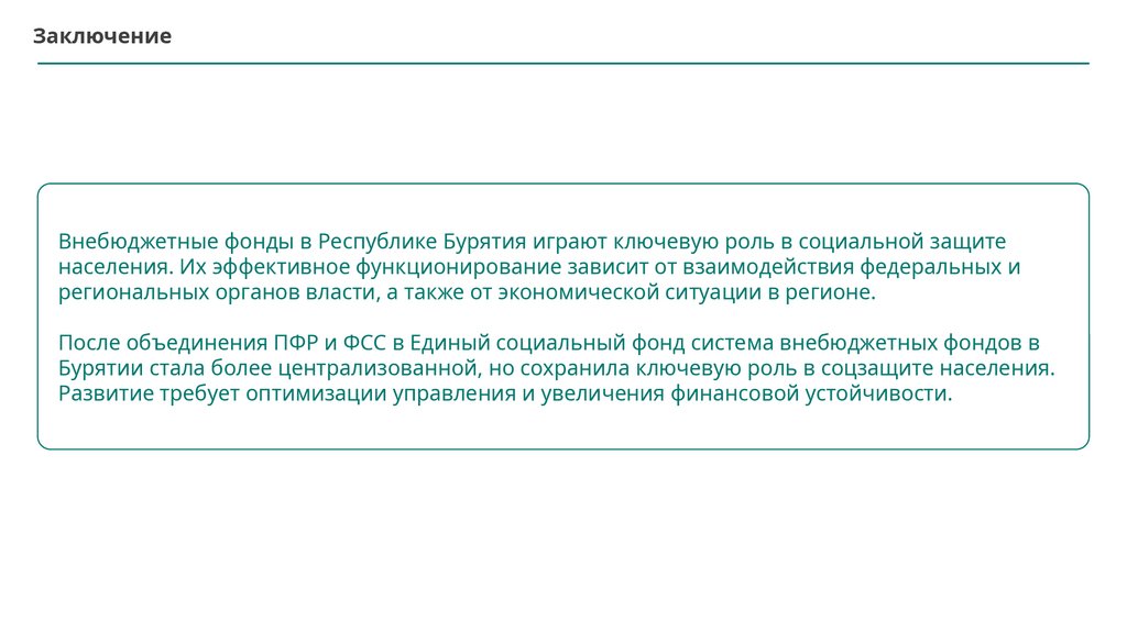 ЗаключениеВнебюджетные фонды в Республике Бурятия играют ключевую роль в социальной защите
