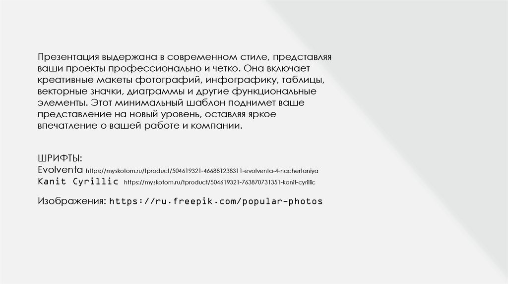 Презентация выдержана в современном стиле, представляяваши проекты профессионально и четко. Она включает