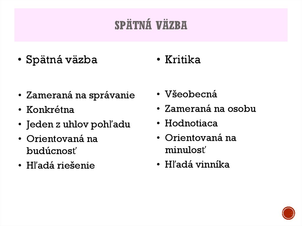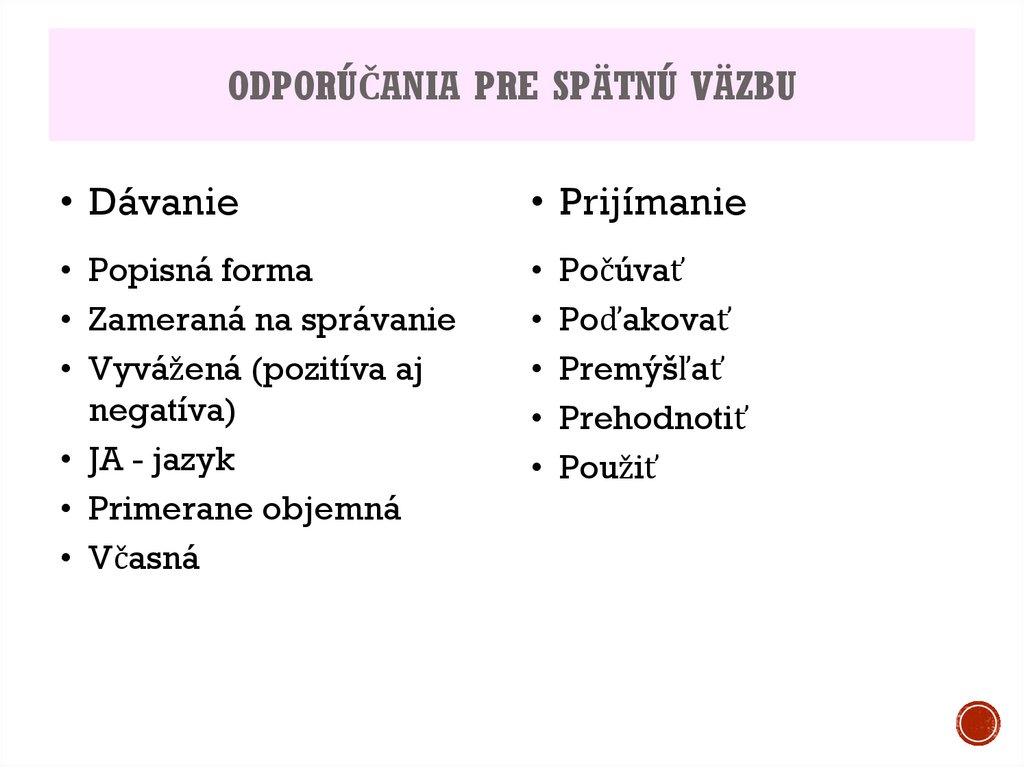 ODPORÚČANIA PRE SPÄTNÚ VÄZBU• Dávanie