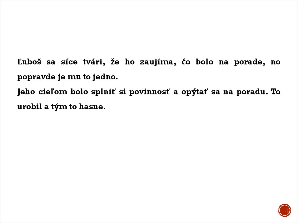 Ľuboš sa síce tvári, že ho zaujíma, čo bolo na porade, nopopravde je mu to jedno.