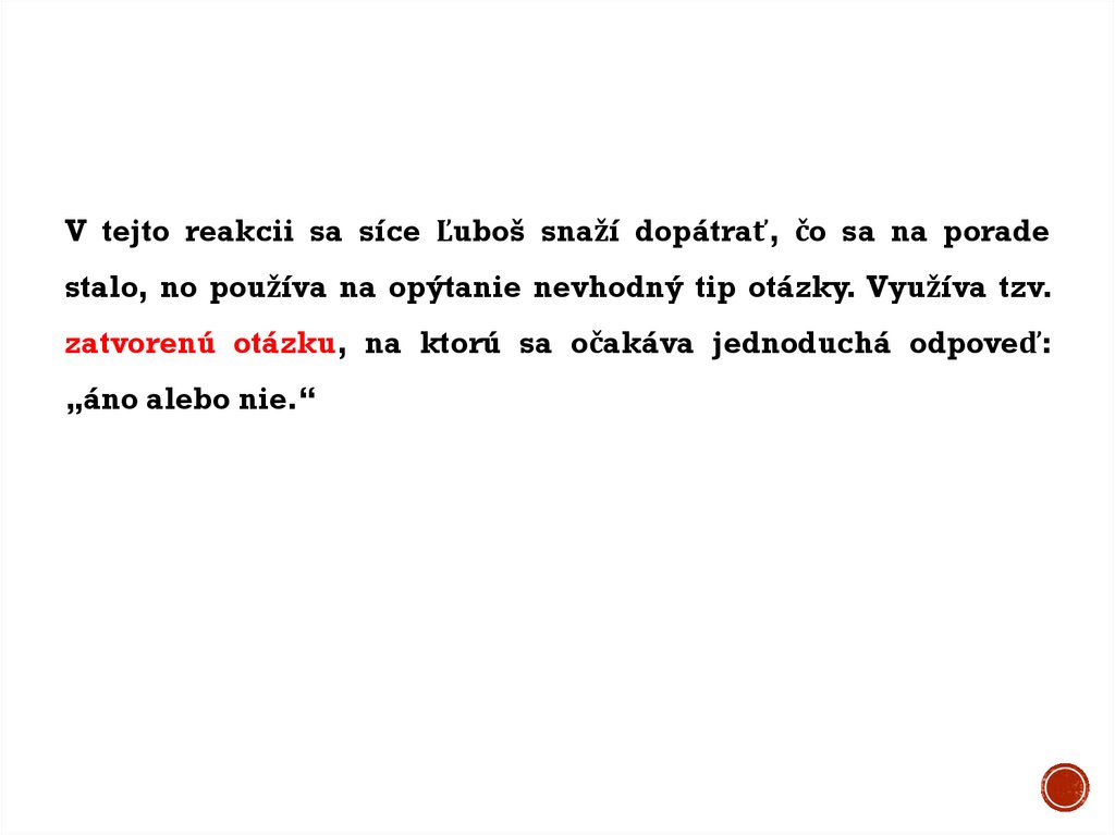 V tejto reakcii sa síce Ľuboš snaží dopátrať, čo sa na poradestalo, no používa na opýtanie nevhodný tip otázky. Využíva tzv.