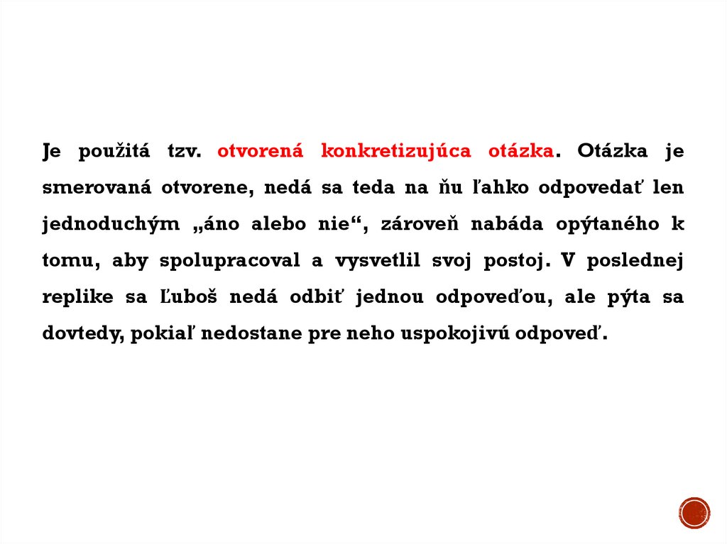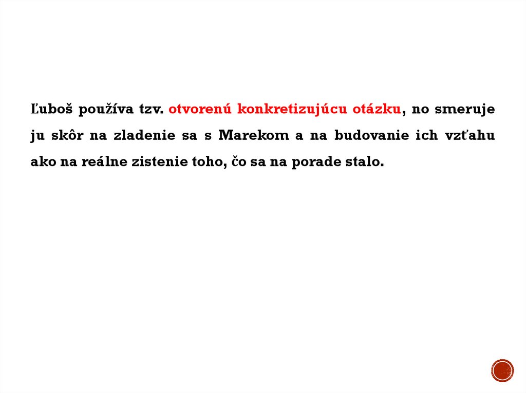 Ľuboš používa tzv. otvorenú konkretizujúcu otázku, no smerujeju skôr na zladenie sa s Marekom a na budovanie ich vzťahu