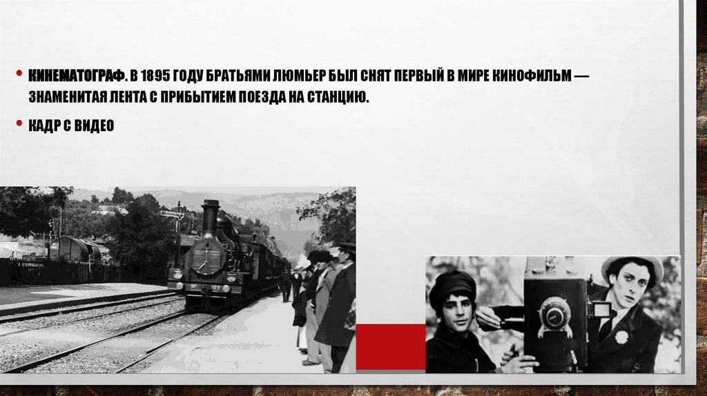 • КИНЕМАТОГРАФ. В 1895 ГОДУ БРАТЬЯМИ ЛЮМЬЕР БЫЛ СНЯТ ПЕРВЫЙ В МИРЕ КИНОФИЛЬМ —ЗНАМЕНИТАЯ ЛЕНТА С ПРИБЫТИЕМ ПОЕЗДА НА СТАНЦИЮ.