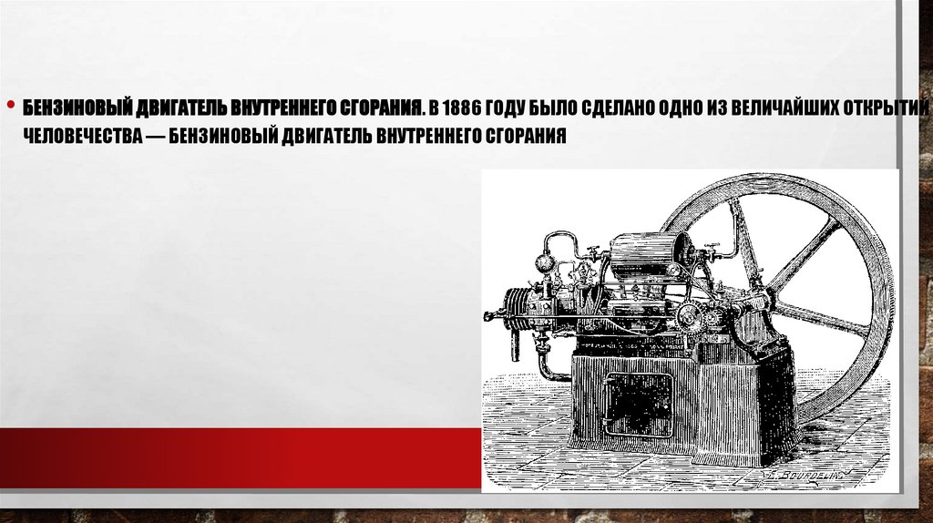 • БЕНЗИНОВЫЙ ДВИГАТЕЛЬ ВНУТРЕННЕГО СГОРАНИЯ. В 1886 ГОДУ БЫЛО СДЕЛАНО ОДНО ИЗ ВЕЛИЧАЙШИХ ОТКРЫТИЙЧЕЛОВЕЧЕСТВА — БЕНЗИНОВЫЙ ДВИГАТЕЛЬ ВНУТРЕННЕГО СГОРАНИЯ