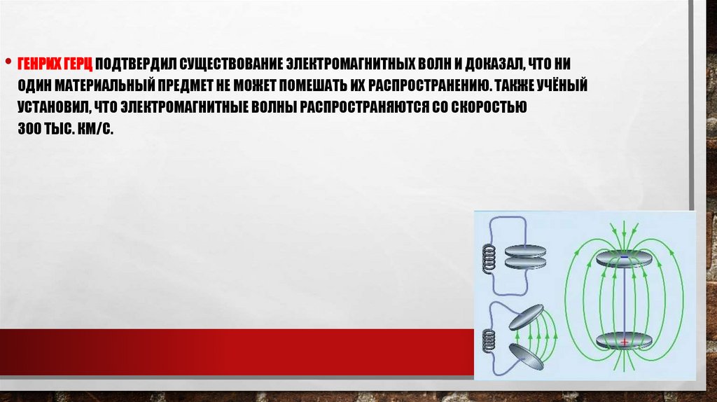 • ГЕНРИХ ГЕРЦ ПОДТВЕРДИЛ СУЩЕСТВОВАНИЕ ЭЛЕКТРОМАГНИТНЫХ ВОЛН И ДОКАЗАЛ, ЧТО НИОДИН МАТЕРИАЛЬНЫЙ ПРЕДМЕТ НЕ МОЖЕТ ПОМЕШАТЬ ИХ РАСПРОСТРАНЕНИЮ. ТАКЖЕ УЧЁНЫЙ