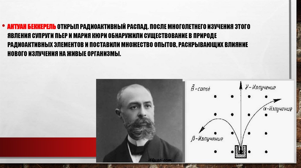 • АНТУАН БЕККЕРЕЛЬ ОТКРЫЛ РАДИОАКТИВНЫЙ РАСПАД. ПОСЛЕ МНОГОЛЕТНЕГО ИЗУЧЕНИЯ ЭТОГОЯВЛЕНИЯ СУПРУГИ ПЬЕР И МАРИЯ КЮРИ ОБНАРУЖИЛИ СУЩЕСТВОВАНИЕ В ПРИРОДЕ