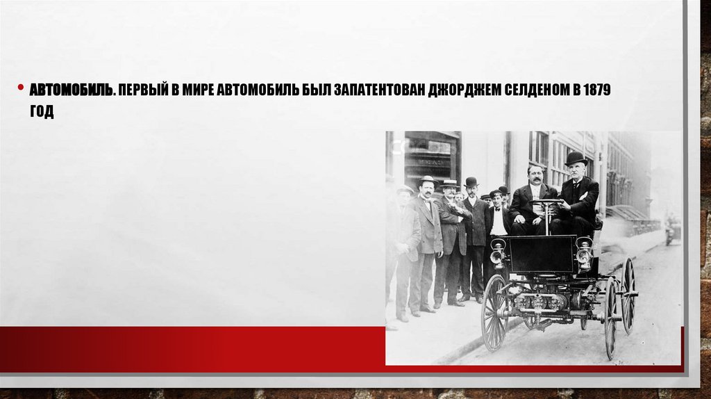 • АВТОМОБИЛЬ. ПЕРВЫЙ В МИРЕ АВТОМОБИЛЬ БЫЛ ЗАПАТЕНТОВАН ДЖОРДЖЕМ СЕЛДЕНОМ В 1879ГОД