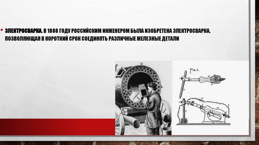 • ЭЛЕКТРОСВАРКА. В 1888 ГОДУ РОССИЙСКИМ ИНЖЕНЕРОМ БЫЛА ИЗОБРЕТЕНА ЭЛЕКТРОСВАРКА,ПОЗВОЛЯЮЩАЯ В КОРОТКИЙ СРОК СОЕДИНЯТЬ РАЗЛИЧНЫЕ ЖЕЛЕЗНЫЕ ДЕТАЛИ